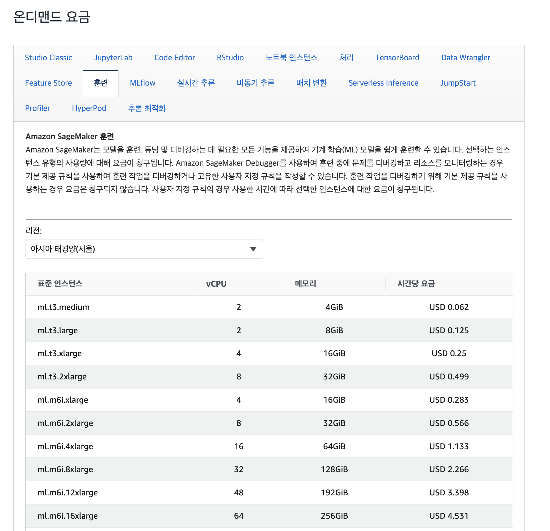 command: 커맨드라인에 플래그를 추가해야 한다면 이 파라미터를 이용하면 된다. 예를 들면,["python3", "-v"]처럼 해볼 수 있다. 기본 값은["python"]이다.instance_type: EC2 인스턴스의 스펙을 지정할 수 있다. 이 예제에서는ParameterString을 사용했는데, 이는 SageMaker Pipeline에서 사용하는 것이다. 파이프라인을 실행할 때name과 값을 키-값 쌍으로 전달하면 파이프라인이 실행될 때 전달한 값이 사용된다.- 사용할 수 있는 인스턴스 타입은 AWS SageMaker 요금 페이지에서 확인할 수 있다.